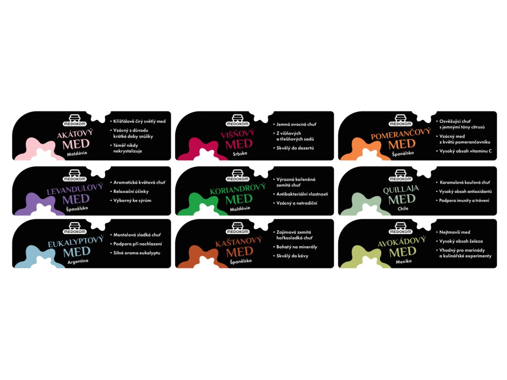 V sadě najdete například osvěžující pomerančový med ze španělských plantáží, aromatický levandulový med, vzácný quillaja z Chile či eukalyptový med z Argentiny. Každý z nich má své specifické vlastnosti – některé podporují imunitu, jiné napomáhají trávení nebo dodávají energii.